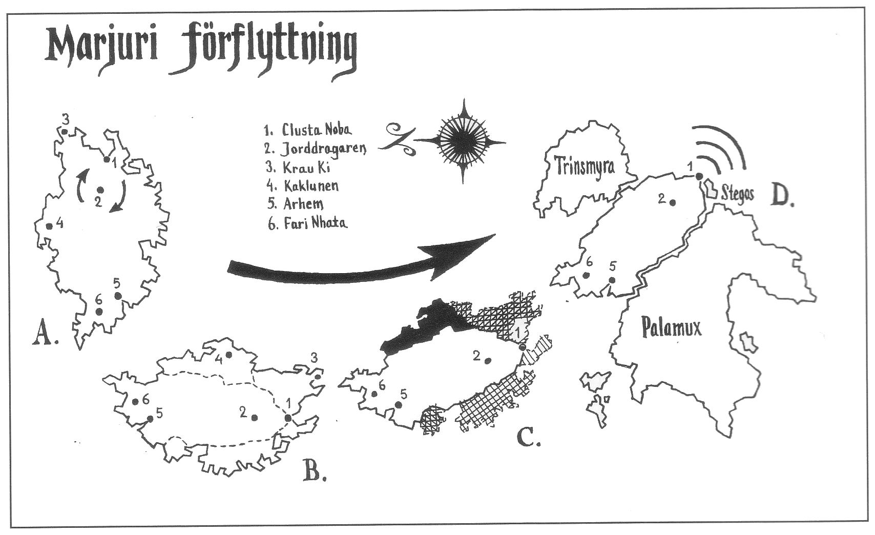 Under färden sönderfaller Marjura så att ön dels får plats i Valbukten, dels passar som en pusselbit mot Palamux och Stegos när den kommer fram till Trakorien enligt bild D.