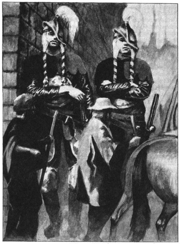 I passets bortre del, mot staden Urma, vaktar en mur med befästningstorn den Moskoriska högslätten mot inkräktare från Klagga och Gwondel Leigû. Då vi närmades en av dess portar tog jag nära till flykten, ty ett par krigare av två och halvannan meters längd steg emot oss i full stridsmundering. De tilltalade oss dock på behaglig muskari, den dialekt man plägar nyttja i dessa trakter, och förklarade sig nödgade att genomsöka våra handelsbalar. Deras anleten var hårda, men fagra och det slog mig att detta var kämpar av det beryktade tolgulderfolket om vilket jag läst i Lususces ”Resbok för öarnes Hieltar”.
